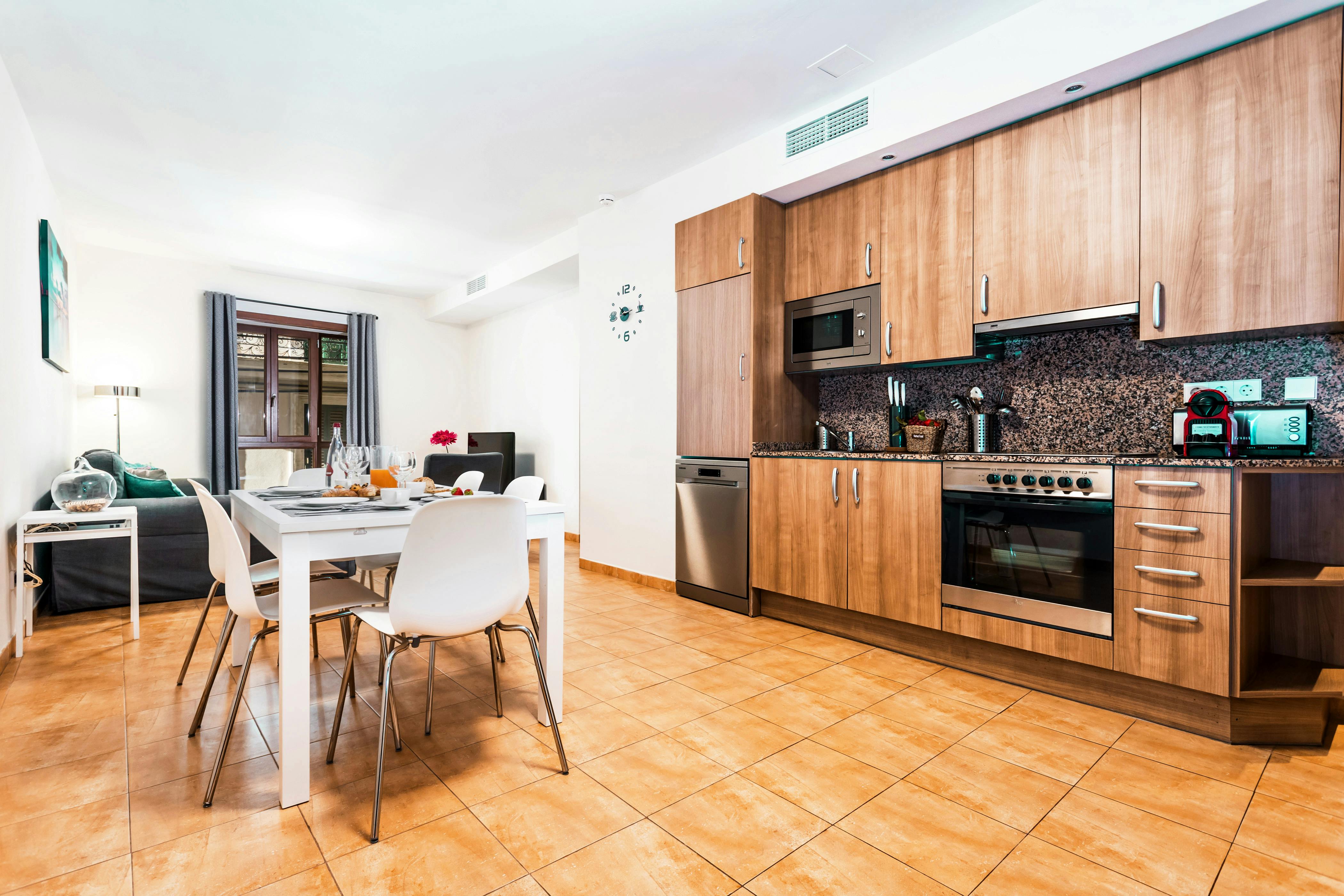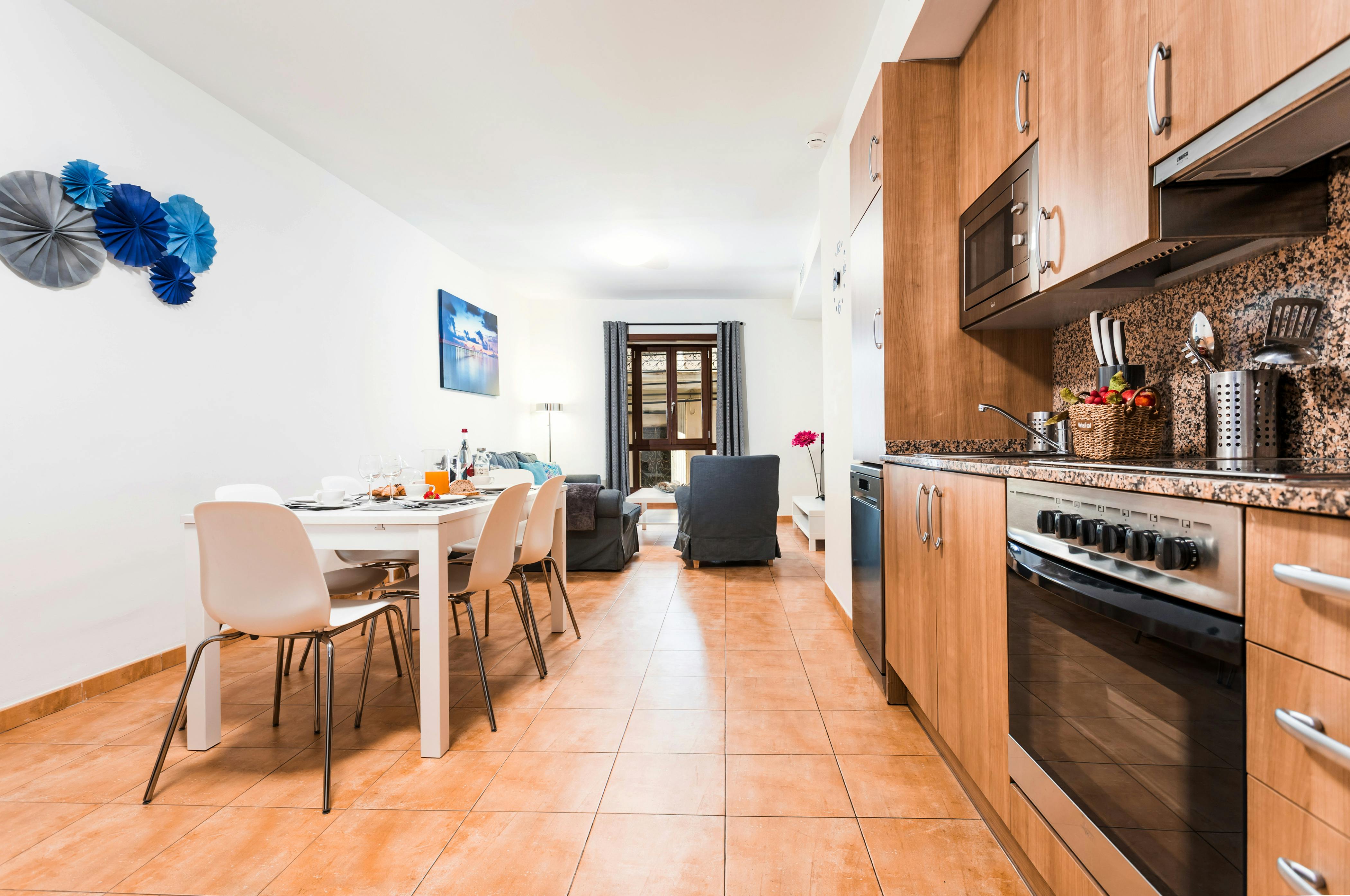 La cocina está equipada con nevera, vitrocerámica, pica para fregar los platos incluyendo bayeta, estropajo y jabón de platos, microondas, horno, lavavajillas, lavadora-secadora, plancha y tabla de planchar. Dispone de utensilios básicos para cocinar como platos, vasos, abridor de botellas, cubiertos, sartén, olla, madera de cortar, cuchillo grande, tazas, cuencos, bolsa de recambio de basura, cubo de fregona, escoba y productos de limpieza.