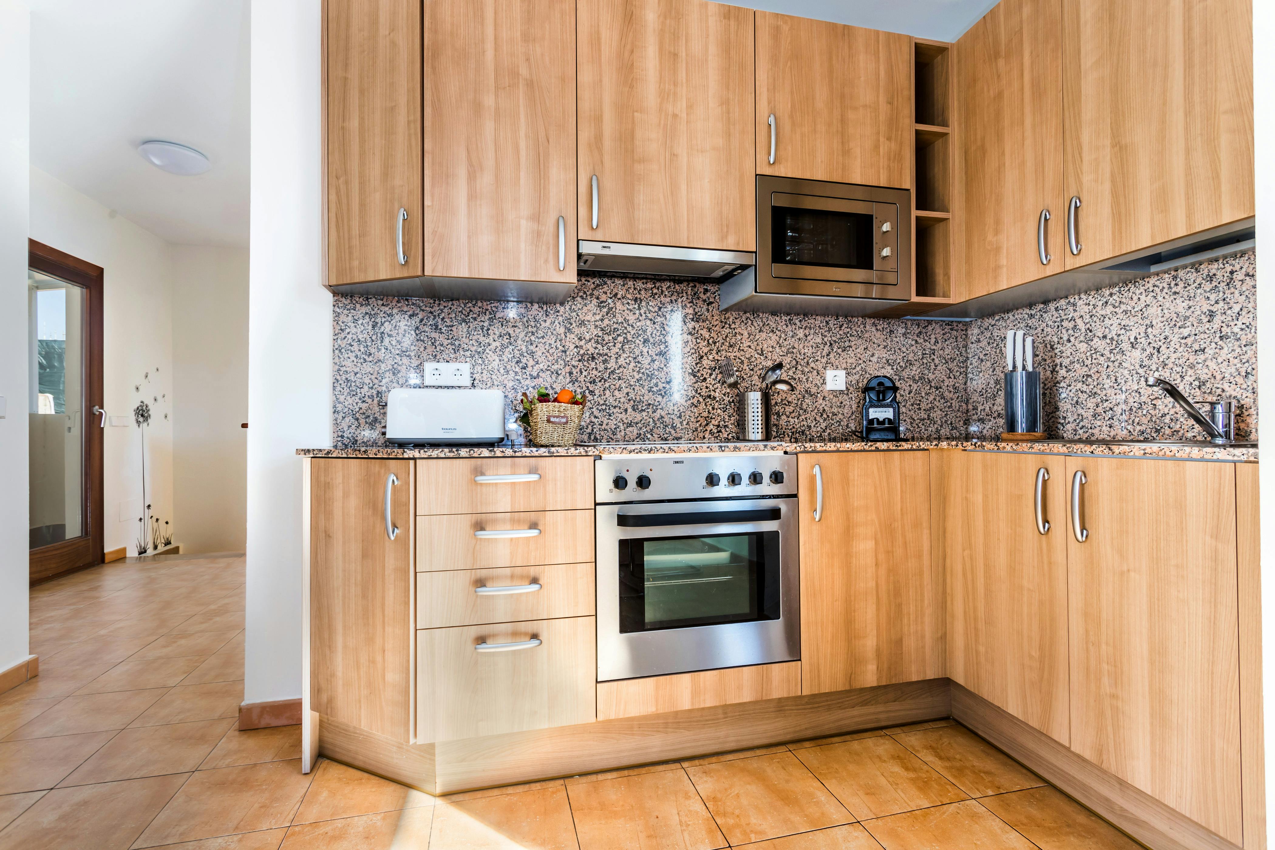La cocina está equipada con nevera, vitrocerámica, pica para fregar los platos incluyendo bayeta, estropajo y jabón de platos, microondas, horno, lavadora, plancha y tabla de planchar. Dispone de utensilios básicos para cocinar como platos, vasos, abridor de botellas, cubiertos, sartén, olla, madera de cortar, cuchillo grande, tazas, cuencos, bolsa de recambio de basura, cubo de fregona, escoba y productos de limpieza.