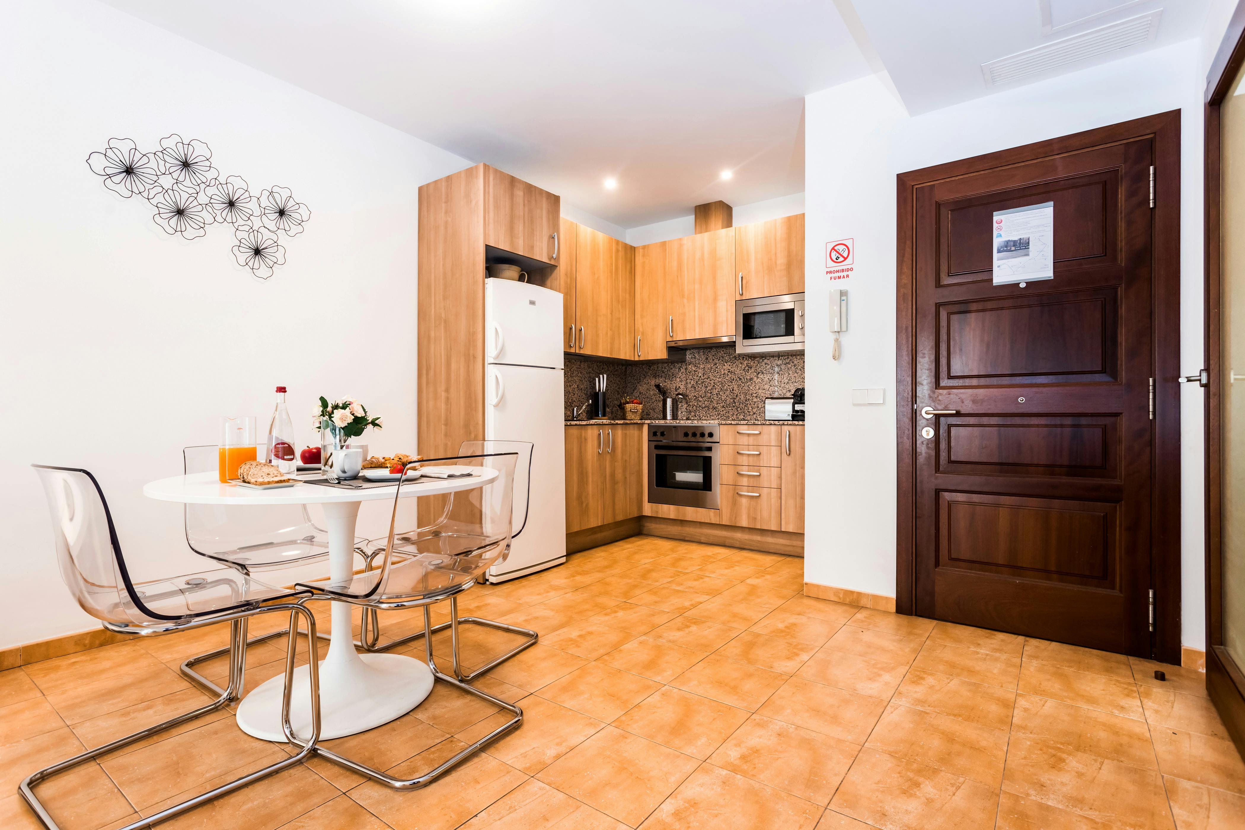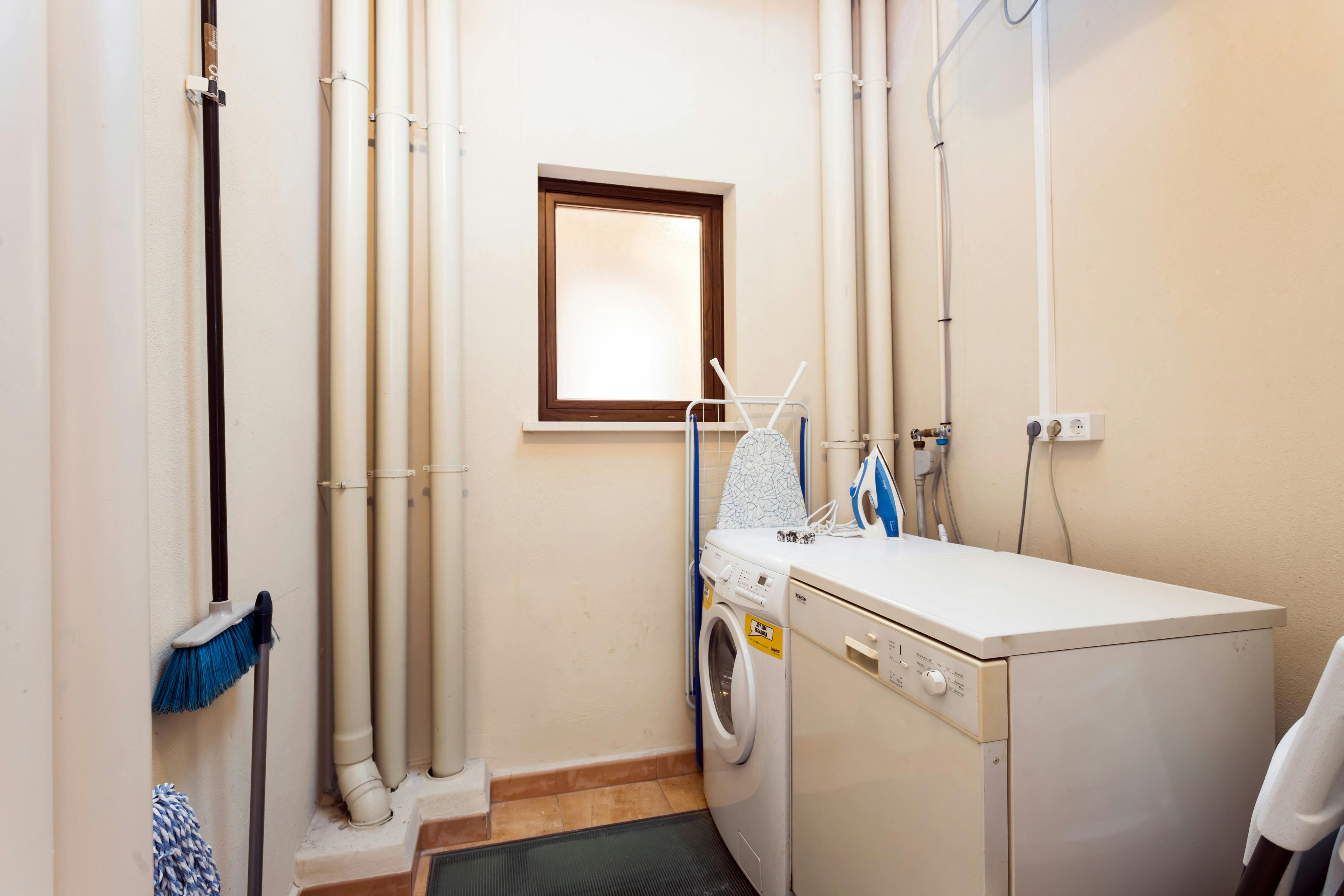 La cocina está equipada con nevera, vitrocerámica, pica para fregar los platos incluyendo bayeta, estropajo y jabón de platos, microondas, horno, lavadora, plancha y tabla de planchar. Dispone de utensilios básicos para cocinar como platos, vasos, abridor de botellas, cubiertos, sartén, olla, madera de cortar, cuchillo grande, tazas, cuencos, bolsa de recambio de basura, cubo de fregona, escoba y productos de limpieza.