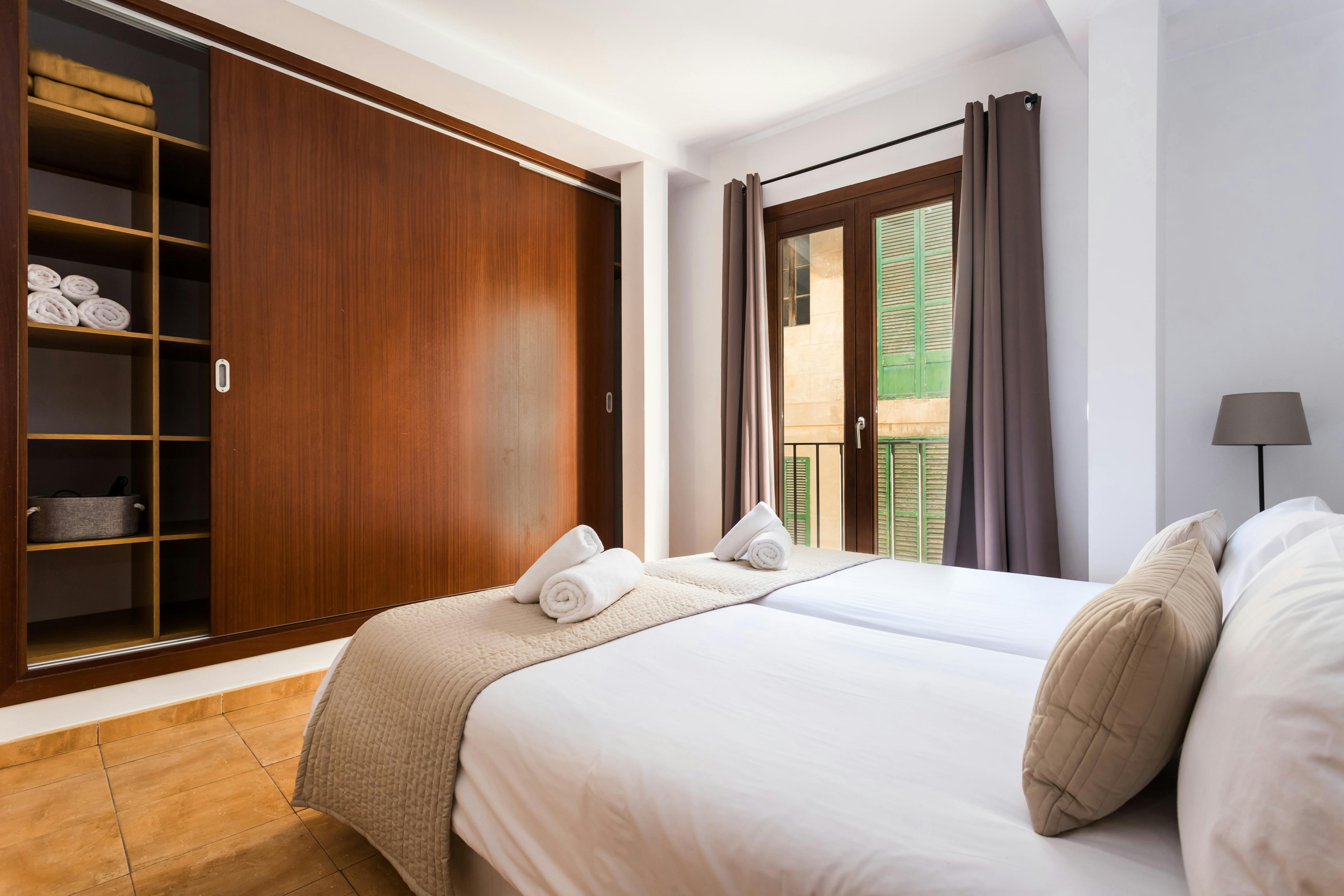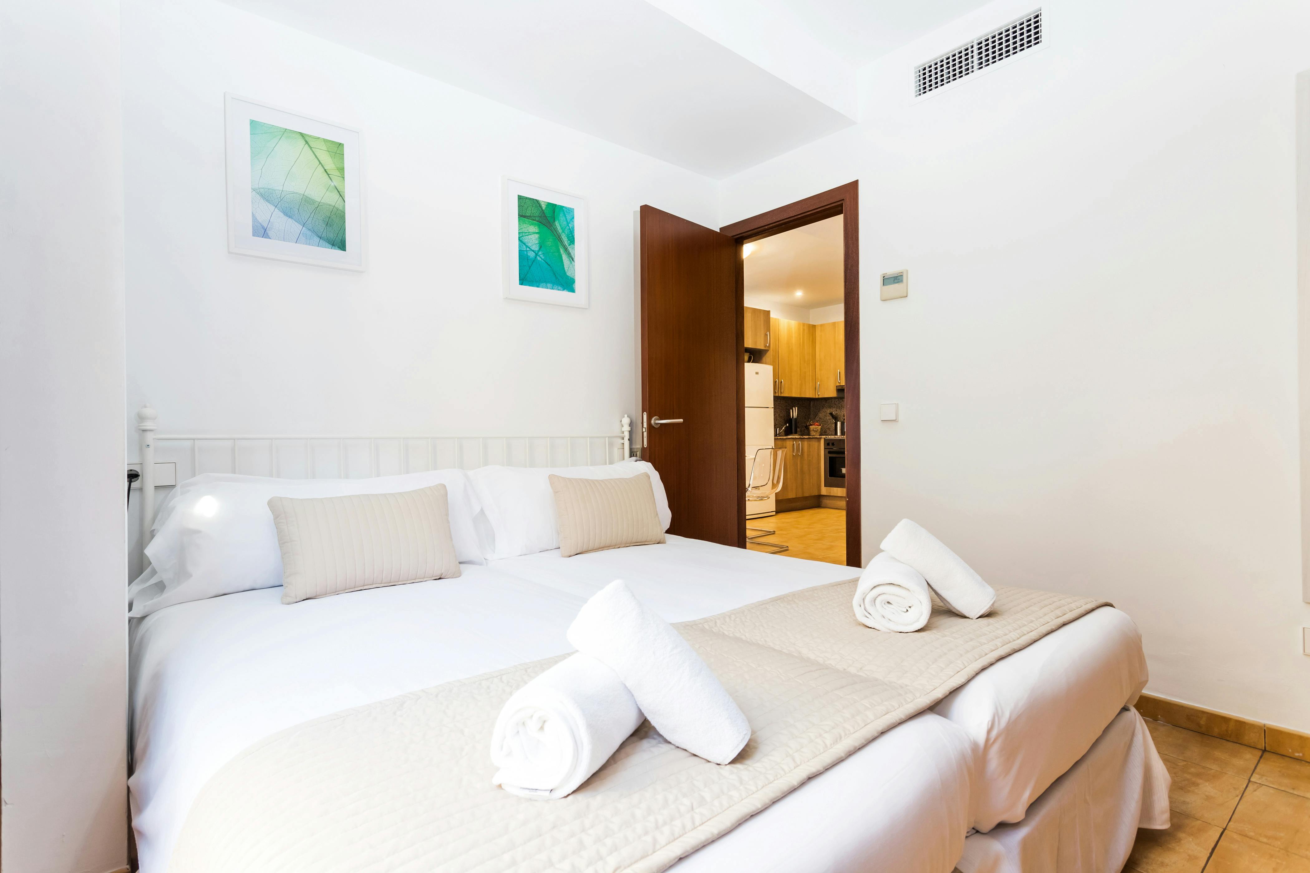 El dormitorio tiene una cama de 1,80 m x 2 m y armarios grandes y empotrados con gran cantidad de perchas.